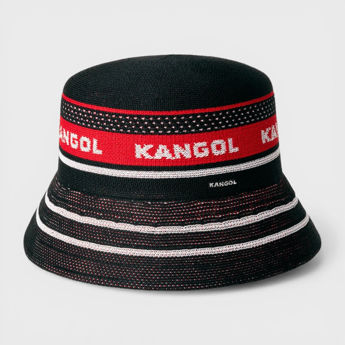 The Tropic Game Stripe Lahinch is a 3 color jacquard made from our Tropic and Recycled Polyester yarns. A stripe and ventilation hole pattern are splashed across the crown with our Kangol® wordmark repeat. This bucket hat is finished with our Kangol® wordmark logo on the left side head